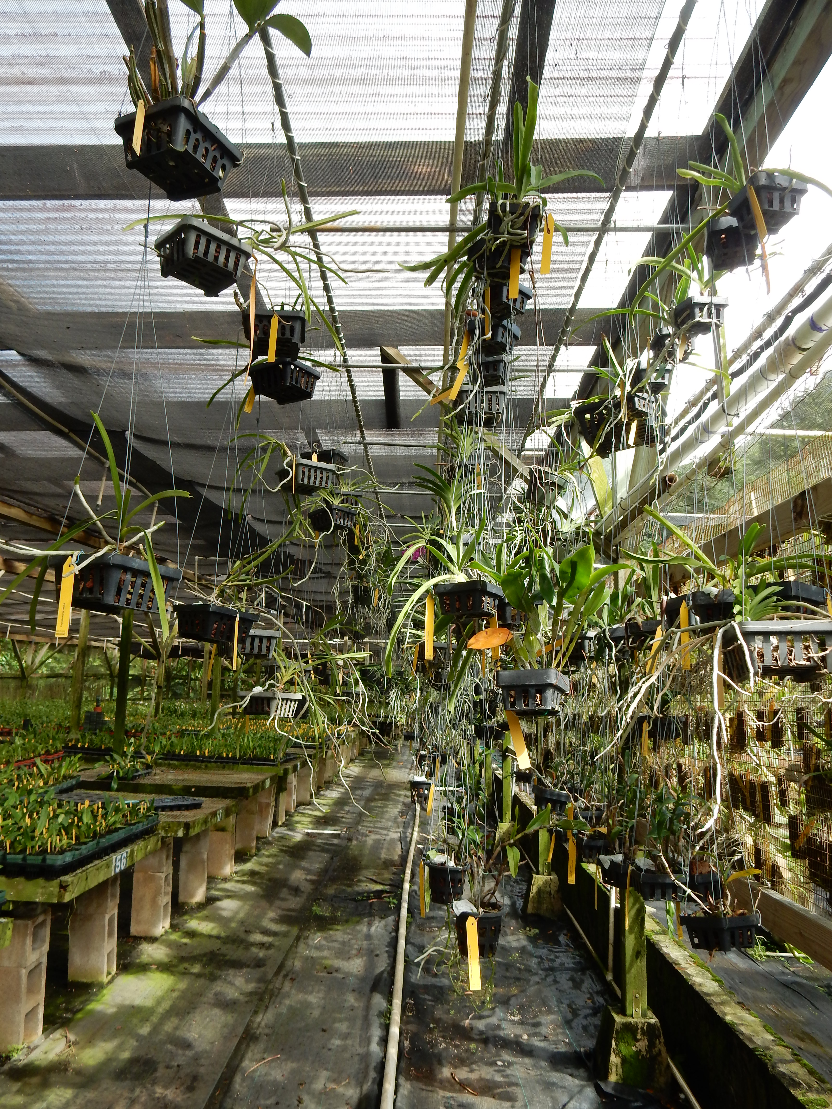 Down the center of a greenhouse