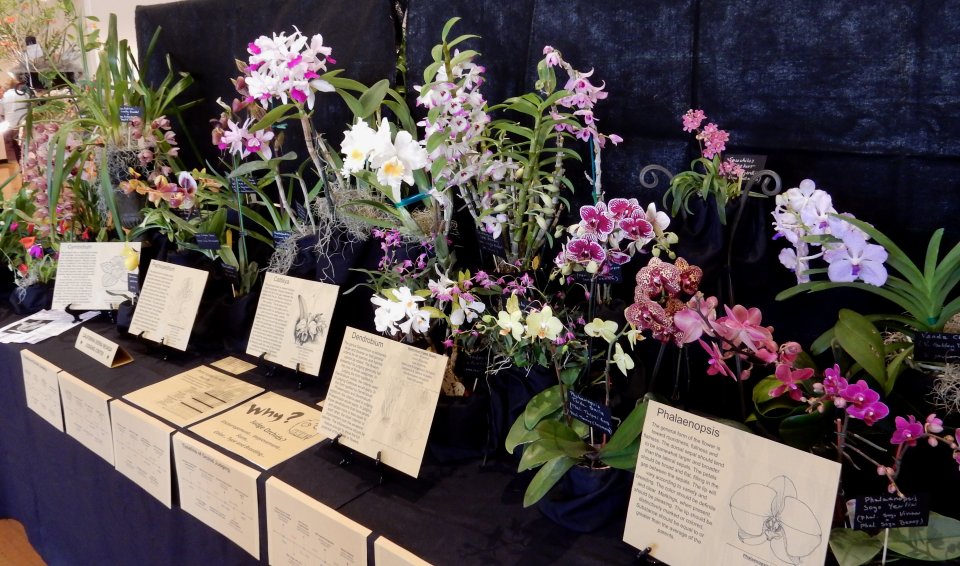 Mixed orchids at California Sierra Nevada Judging Center table